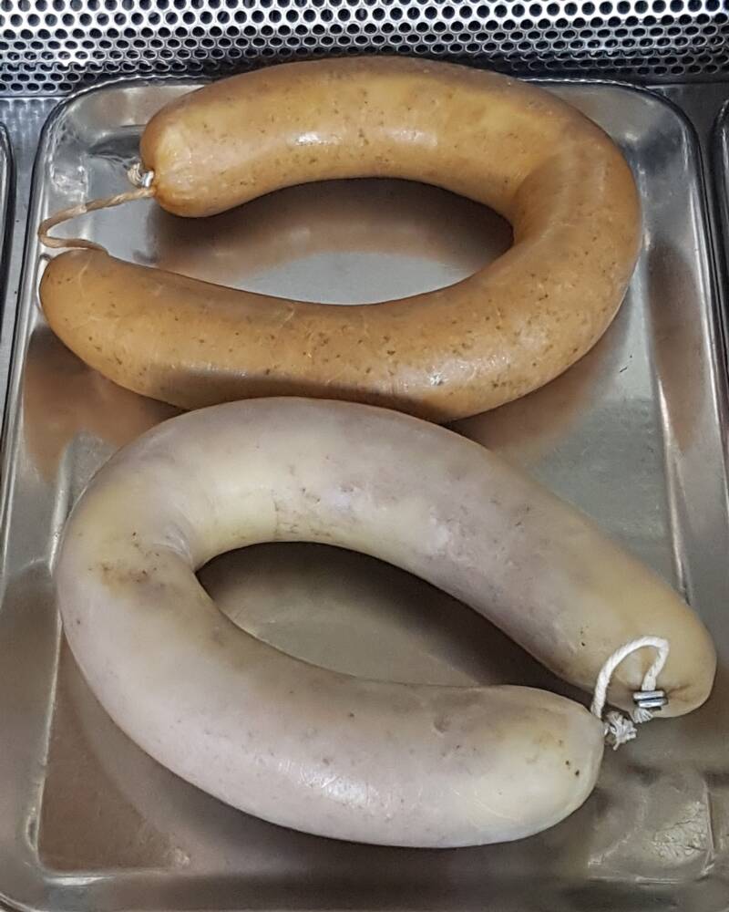 Herzhaft würzige Streichleberwurst mit frischer Schweineleber und gepökelten Schweinefleischwürfel im Naturdarm über Buchenholz geräuchert